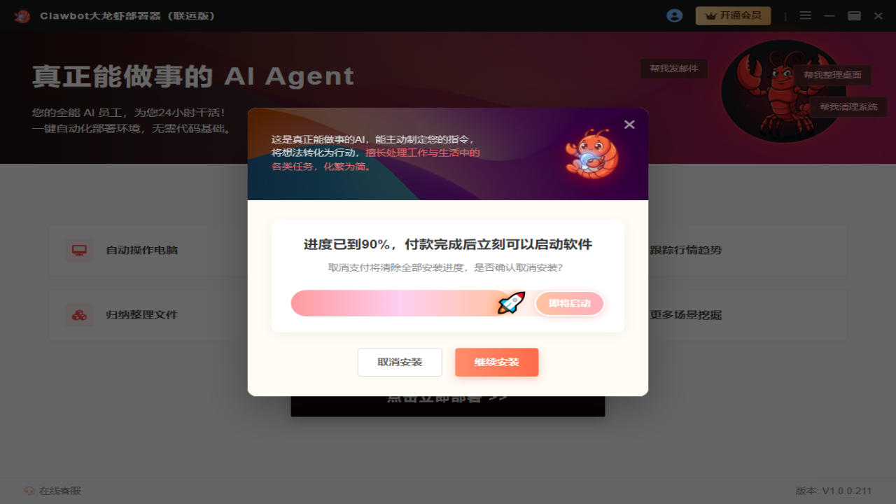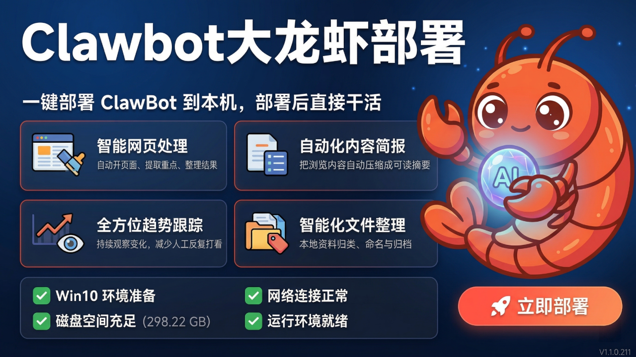 ClawBot大龙虾部署器是一款零门槛的AI养虾软件,即使不懂代码也能一键本地部署,全程AI养虾不卡顿、无广告、纯净运行,安全高效。