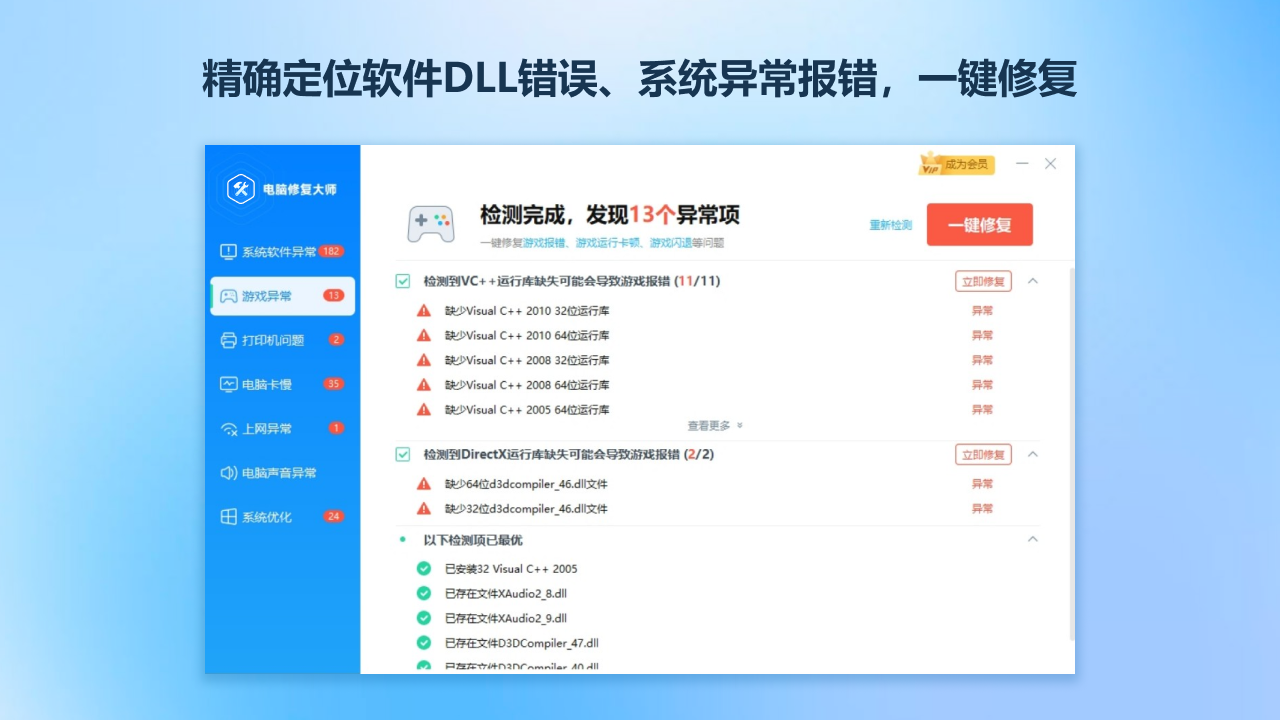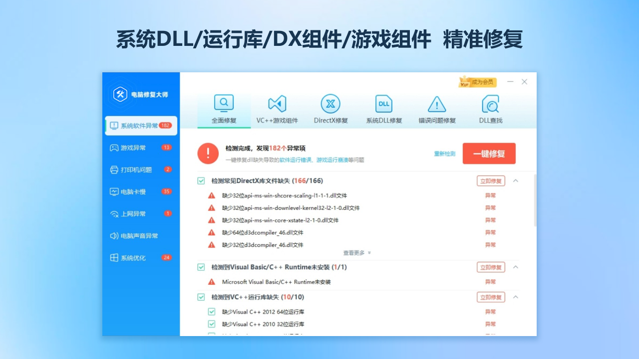 DLL万能修复-电脑修复大师是一款专业的电脑优化与修复工具,旨在帮助用户提升电脑性能,解决常见系统故障。通过一站式功能,用户可以轻松解决电脑卡顿、游戏异常、DLL报错等问题,让电脑始终保持最佳运行状态。